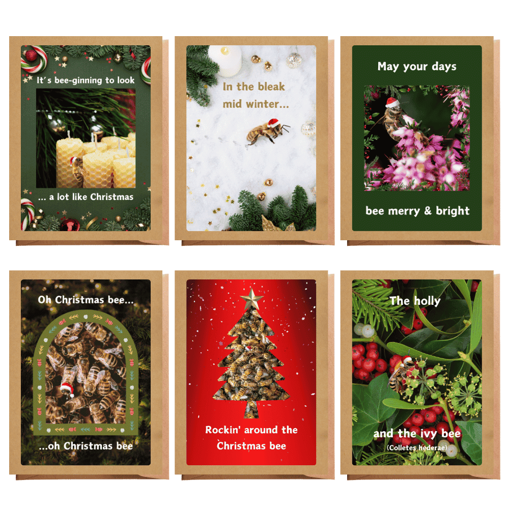 Spread a little seasons cheer with these hand-made Bee Inspired Eco Education Christmas cards. Each pack contains 6 individual designs, mounted on 5 x 7 Kraft card. Envelopes are included and the card is blank inside.